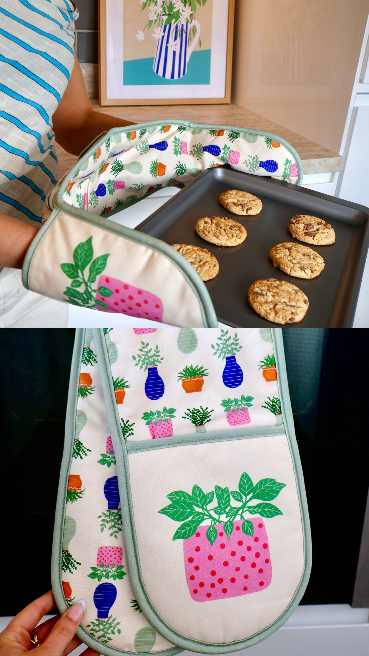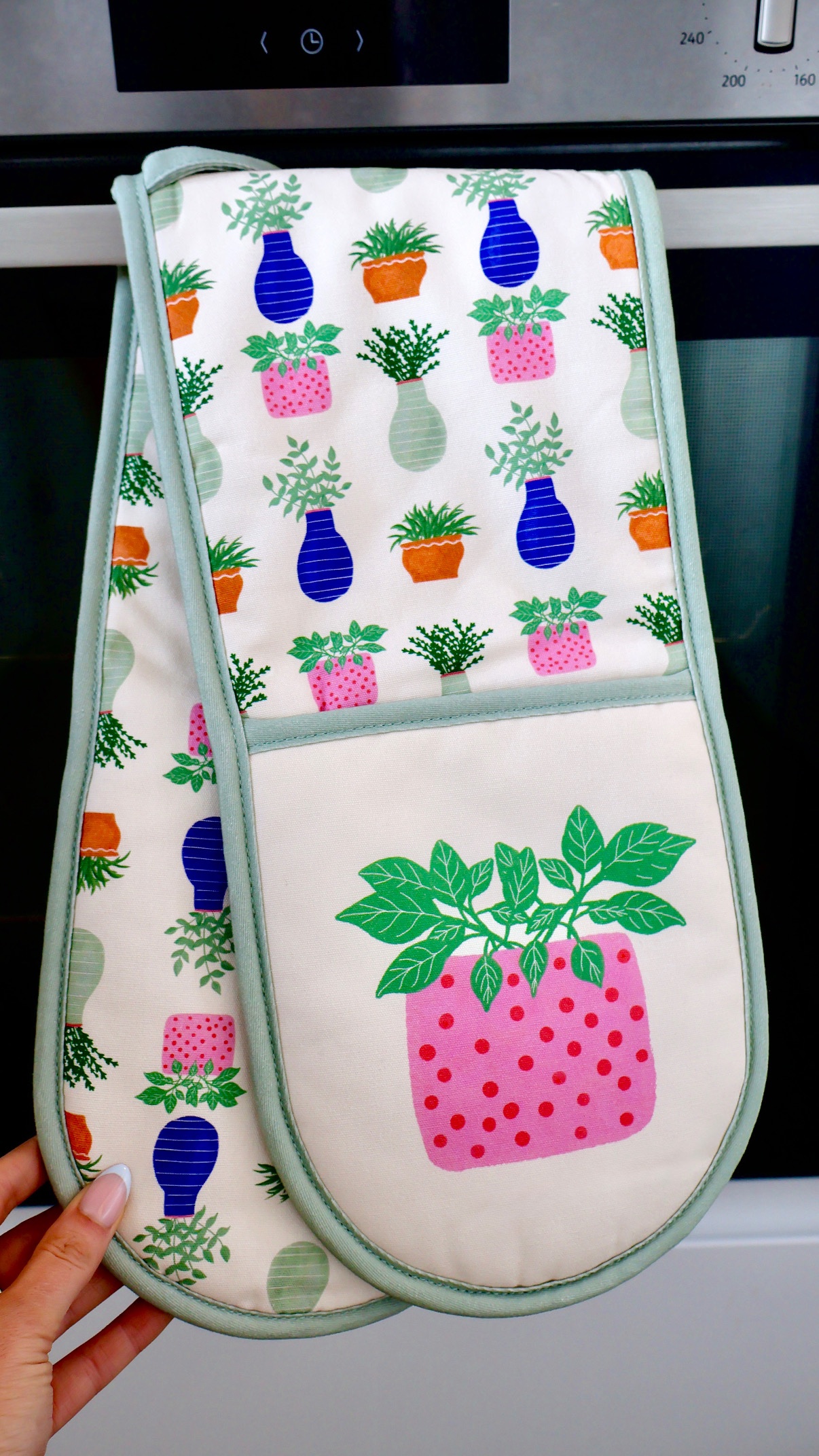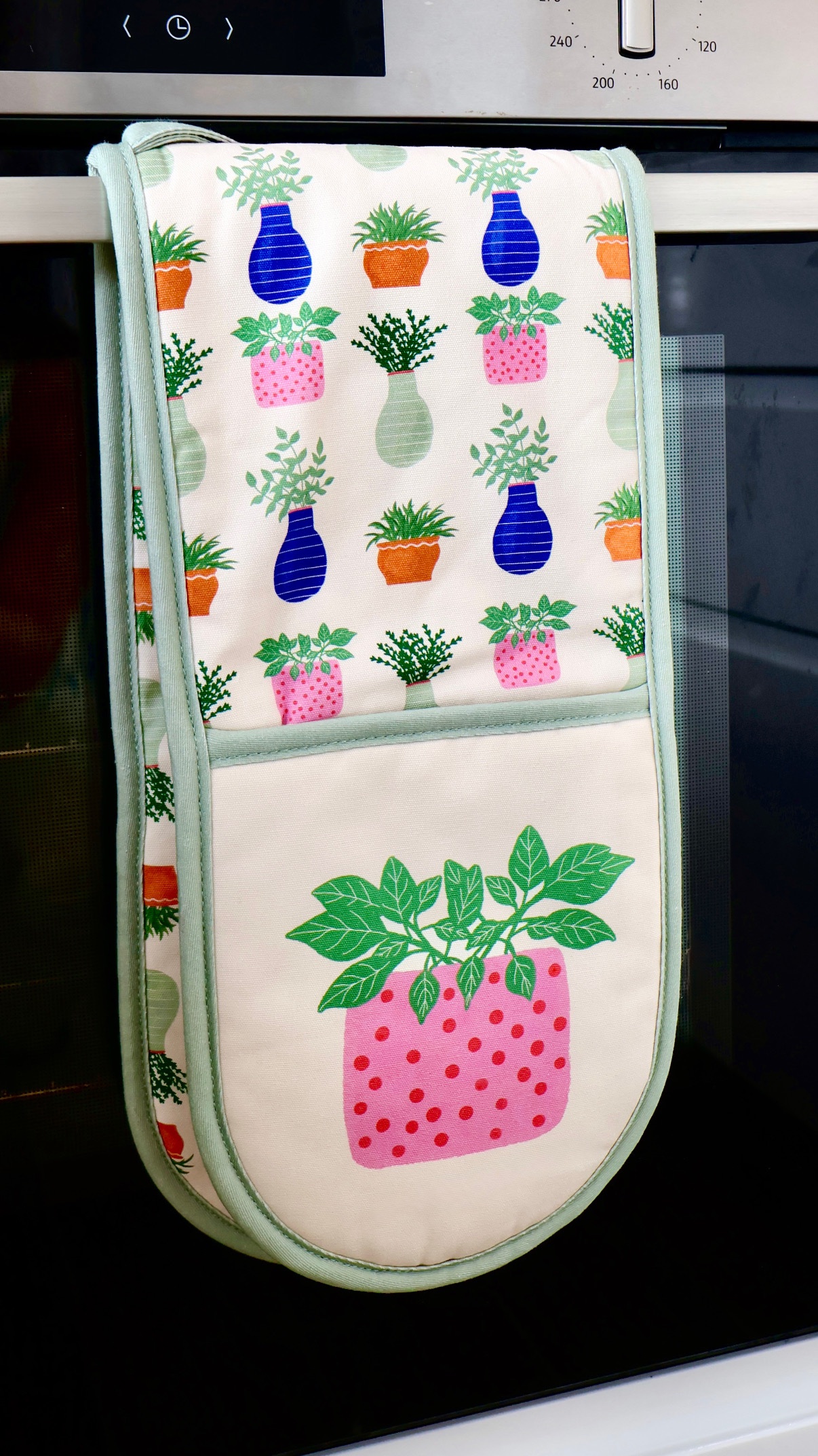 Bring a fresh, calming feel to your kitchen with our Evergreen Plants double oven glove. Set against a soft cream background, this design features a collection of lush green plants in a variety of charming pots – perfect for adding a subtle, nature-inspired touch to your space.